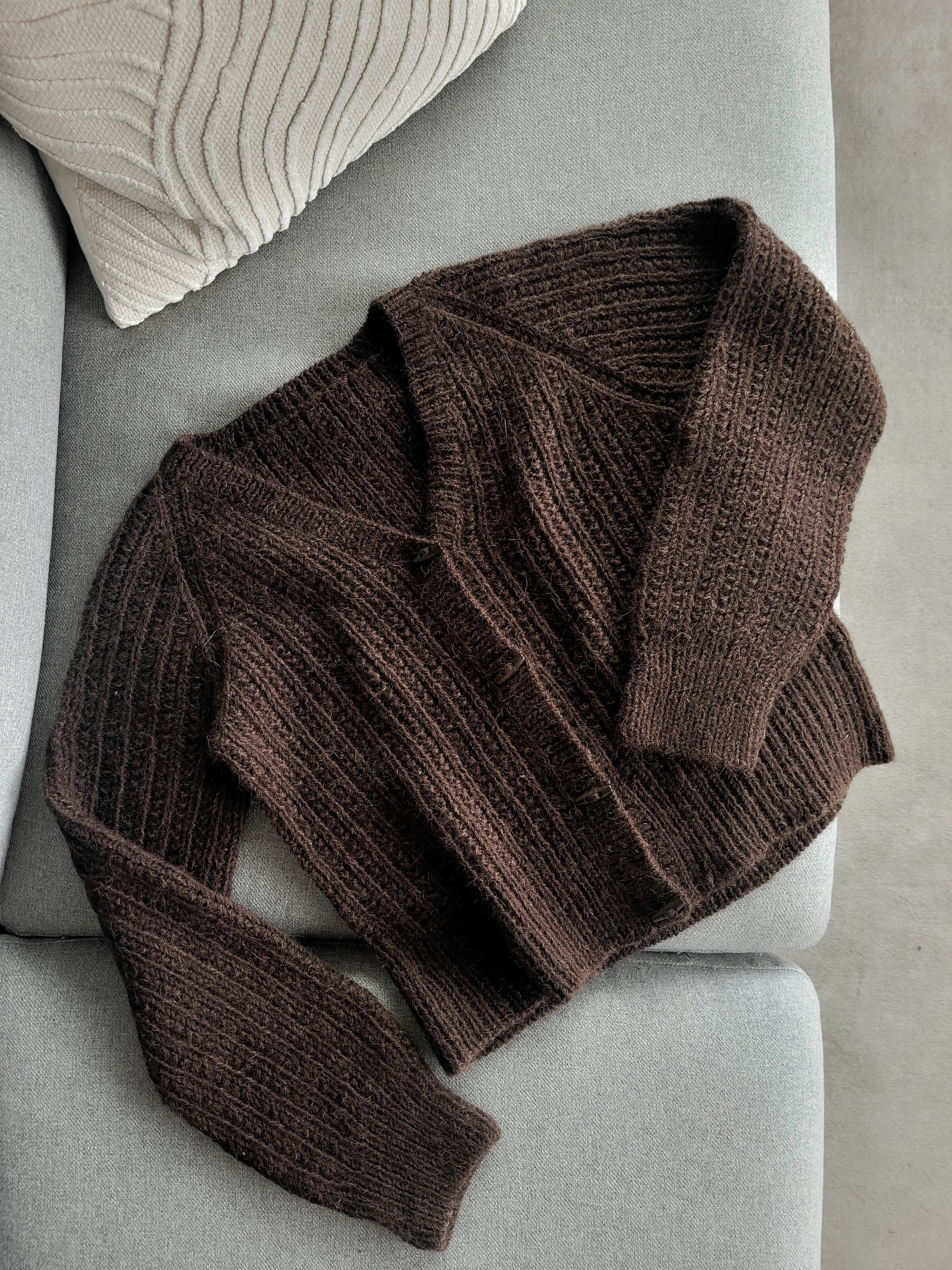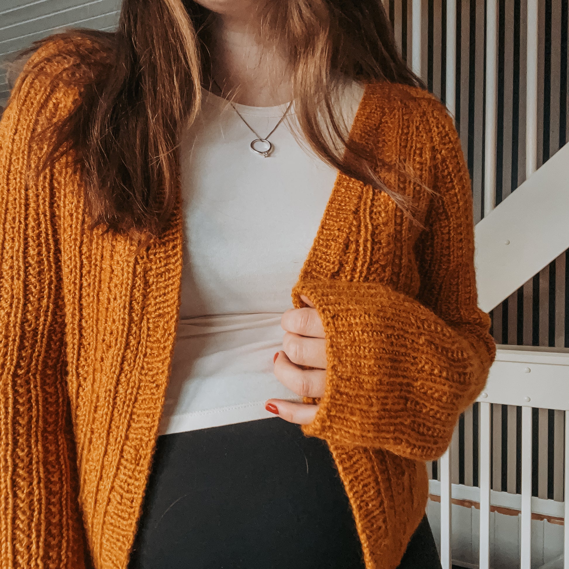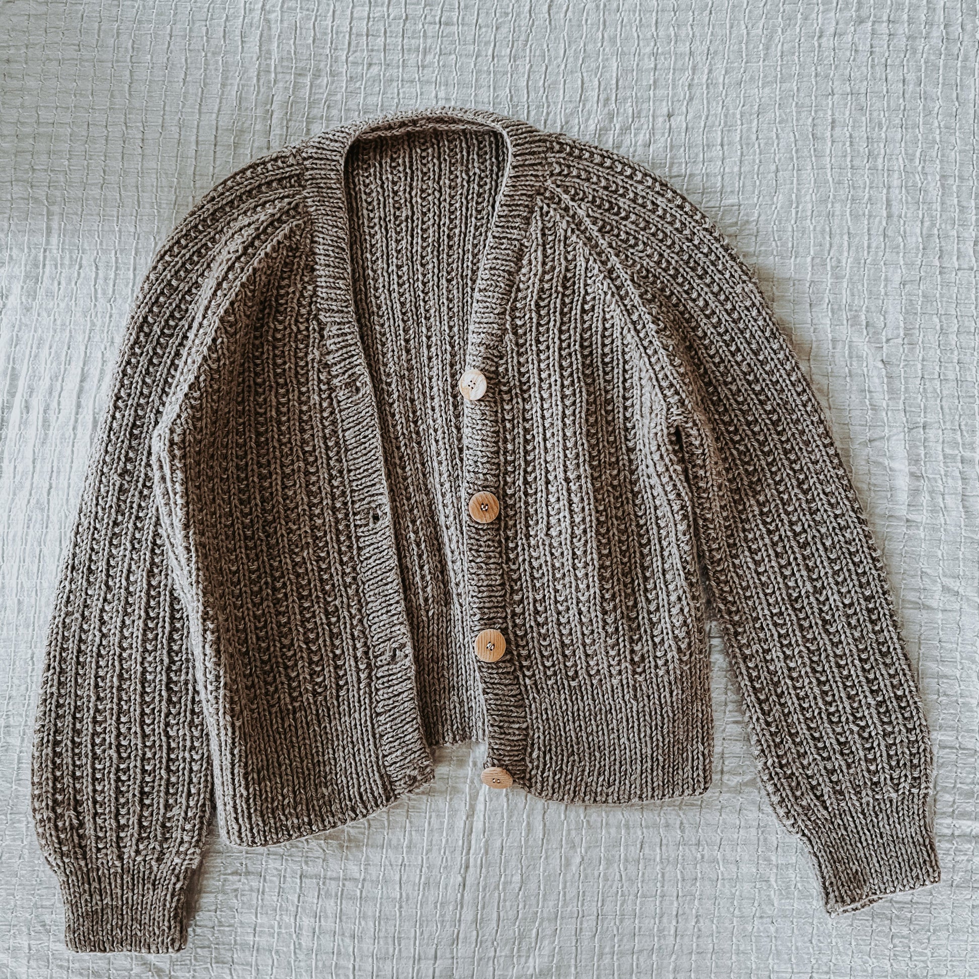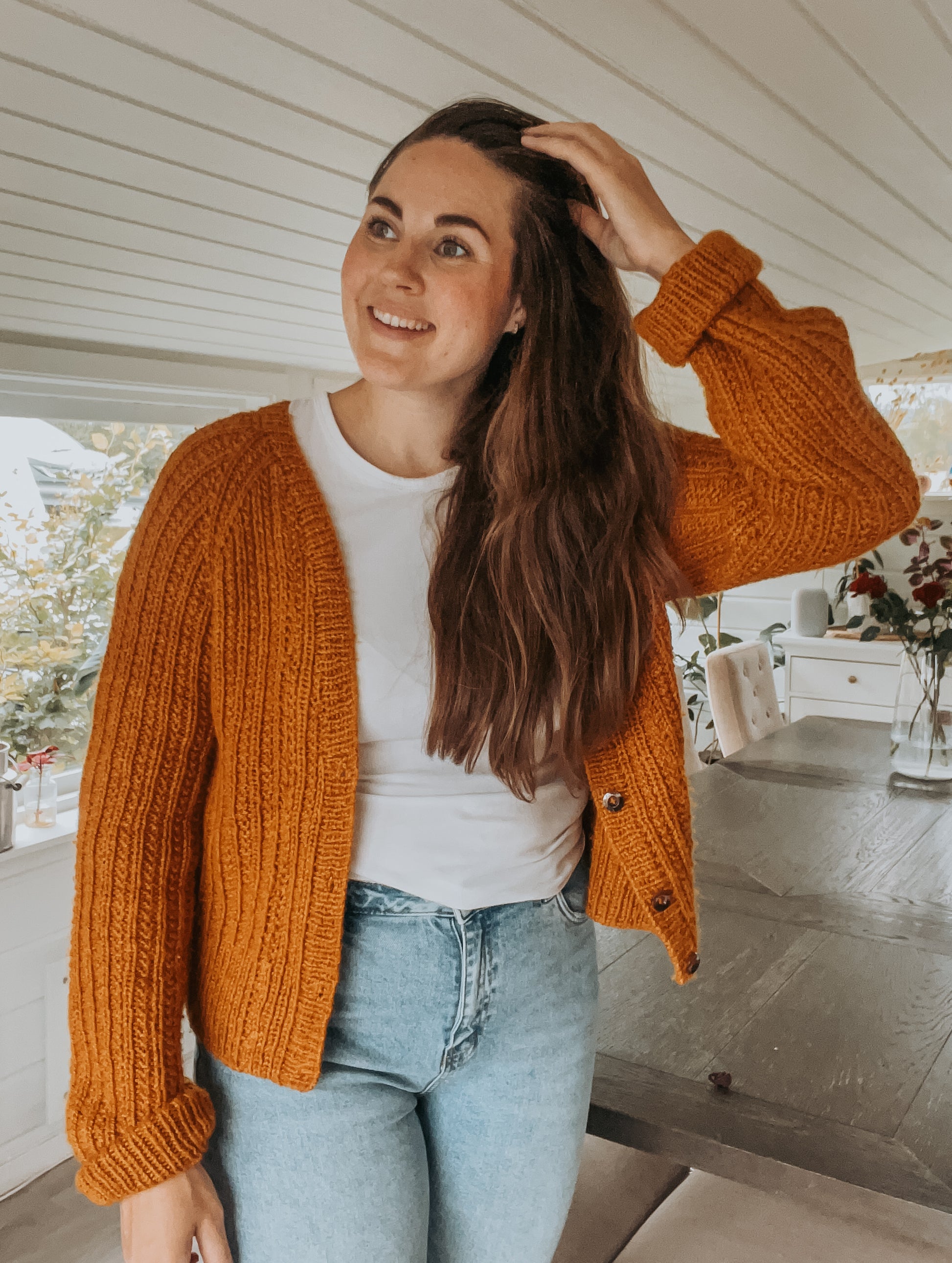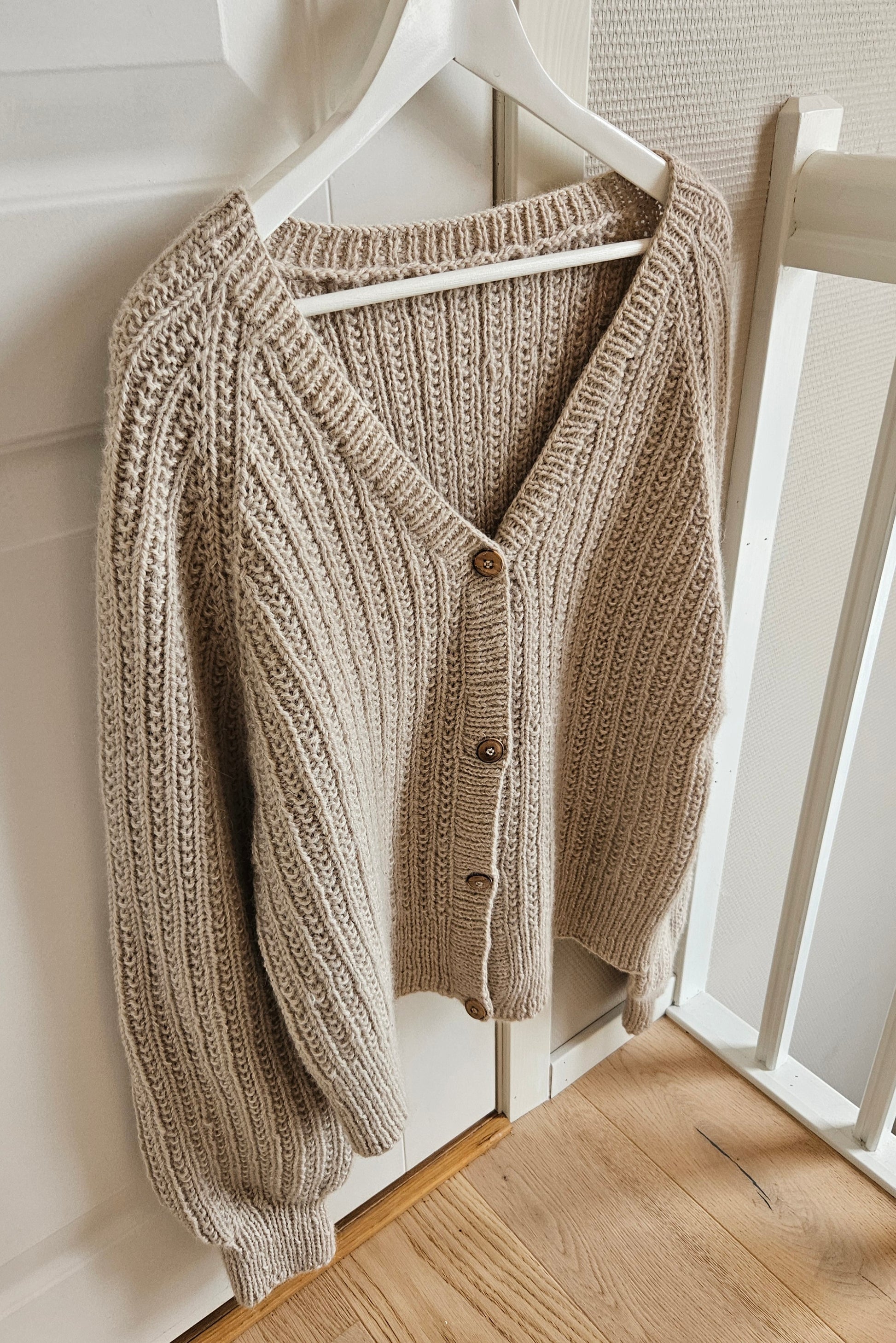 Min Amaliejakke strikkes ovenfra og ned, med raglanøkninger og V-hals. Jakken strikkes i et strukturmønster bestående av rette og vrange masker, med lange vrangbordkanter nederst på ermer og bol.