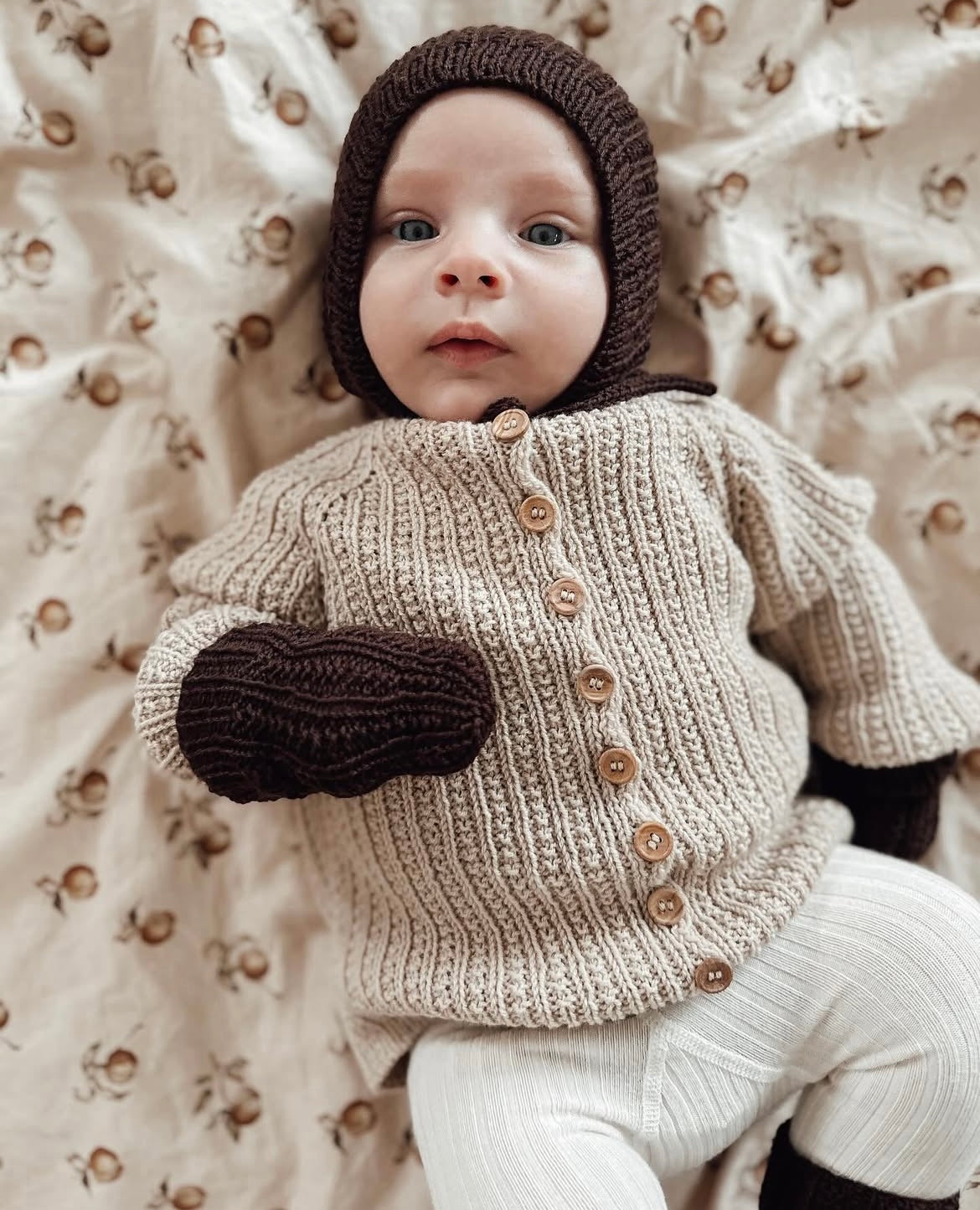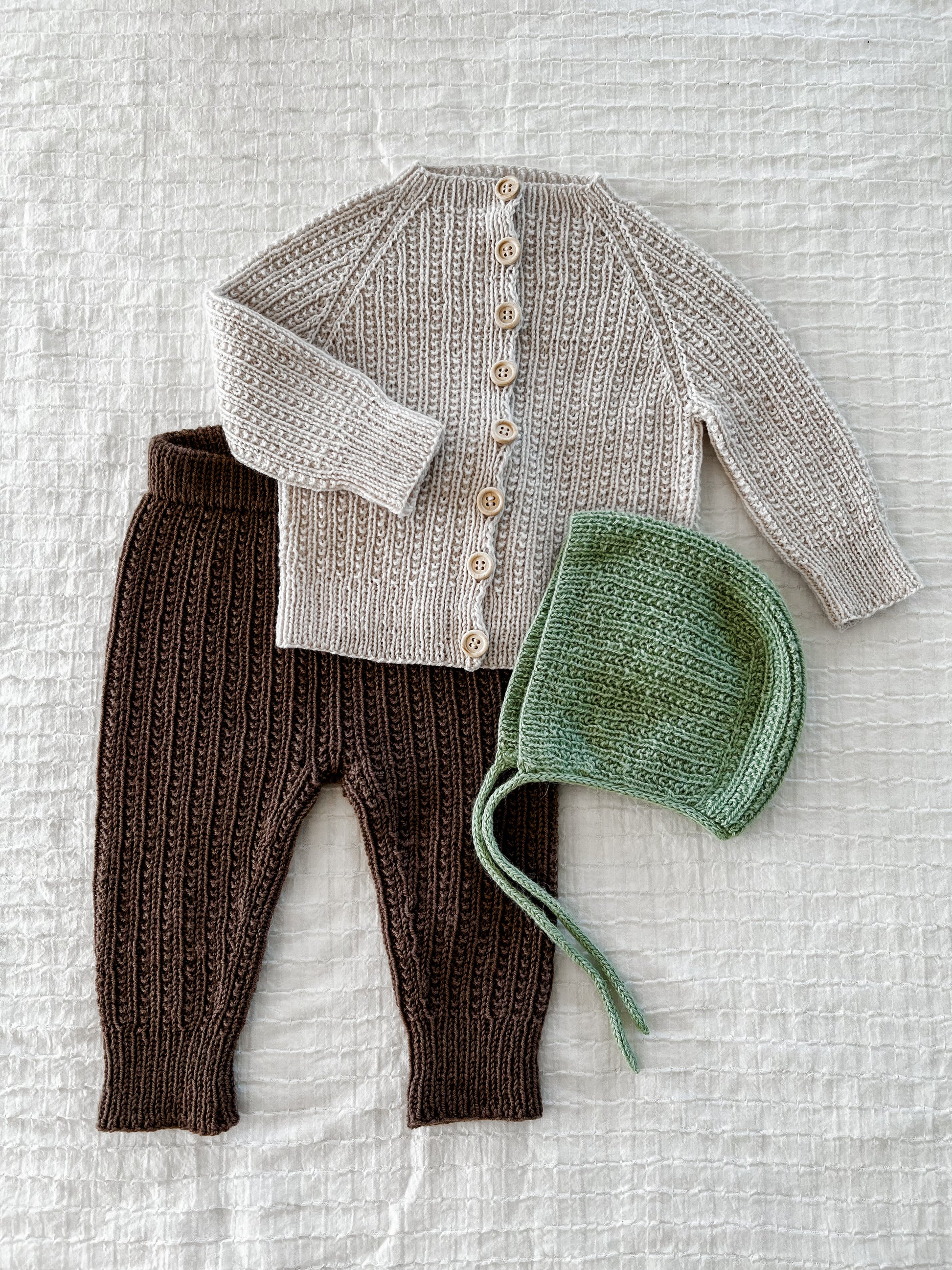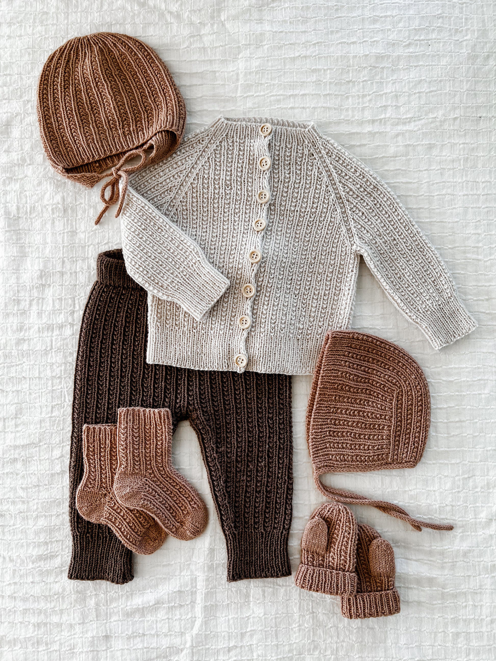 Oppskrift på Tynn Amalie jakke og bukse, samt tilbehør i samme strukturmønster; kyse, lue, votter og sokker. Plaggene strikkes med en elastisk struktur, slik at de utvider seg etter hvert som barnet vokser, og tillater mye lek og bevegelse.